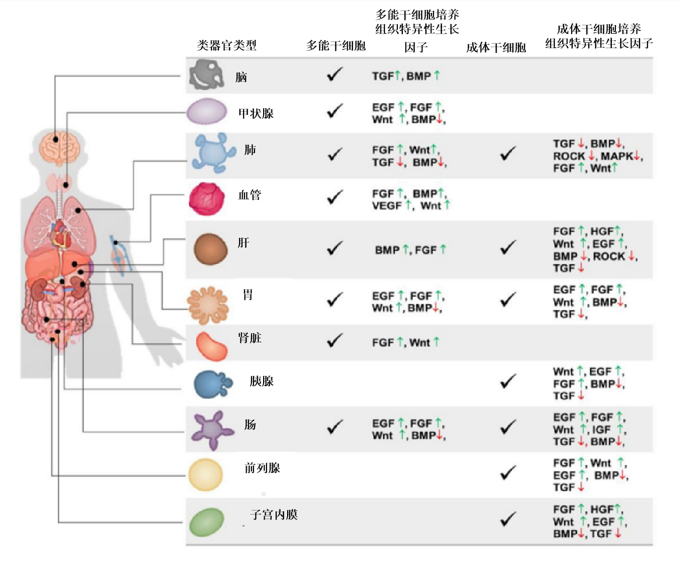 成功建立類器官的關(guān)鍵,除了所需的生物材料基質(zhì)外,生長(zhǎng)因子作為細(xì)胞培養(yǎng)、增殖及分化所必需的物質(zhì)也必當(dāng)優(yōu)先考慮,從而保證類器官中的干細(xì)胞長(zhǎng)期生存的能力。通過(guò)優(yōu)化培養(yǎng)物生長(zhǎng)條件模擬生理組織自我更新或損傷修復(fù)過(guò)程中的干細(xì)胞巢環(huán)境,如提供基底膜基質(zhì)(即Matrigengel)并添加一系列激動(dòng)劑(如Wnt和酪氨酸激酶受體)和抑制劑(如骨形態(tài)發(fā)生蛋白/轉(zhuǎn)化生長(zhǎng)因子-β)可達(dá)到上述目的。不同的生長(zhǎng)因子組合也能誘導(dǎo)多能干細(xì)胞向不同的類器官細(xì)胞分化進(jìn)而獲得我們需要的類器官類型(圖1),同時(shí)不同的細(xì)胞因子也是培養(yǎng)不同種類的類器官的關(guān)鍵物質(zhì)(圖2)。